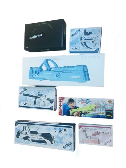 4. Para las pistolas de agua: vienen con todos los componentes necesarios. Puedes usar tus propios enchufes en casa para cargar las baterías. Hay enchufes de repuesto disponibles por un cargo adicional.