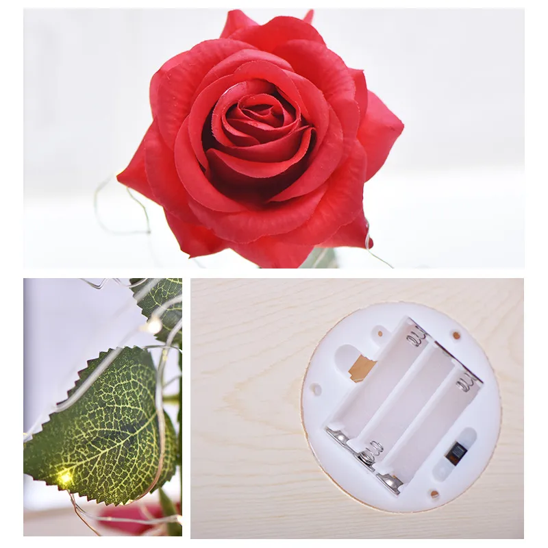 The rose and LED lights are encased in a high-quality glass dome, providing protection while allowing full visibility. The dome's sleek design adds a touch of sophistication, making it a standout piece in any room.