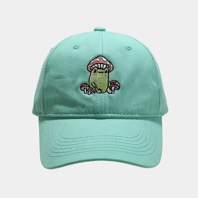Gorra de béisbol bordada con diseño de rana y hongo de dibujos animados