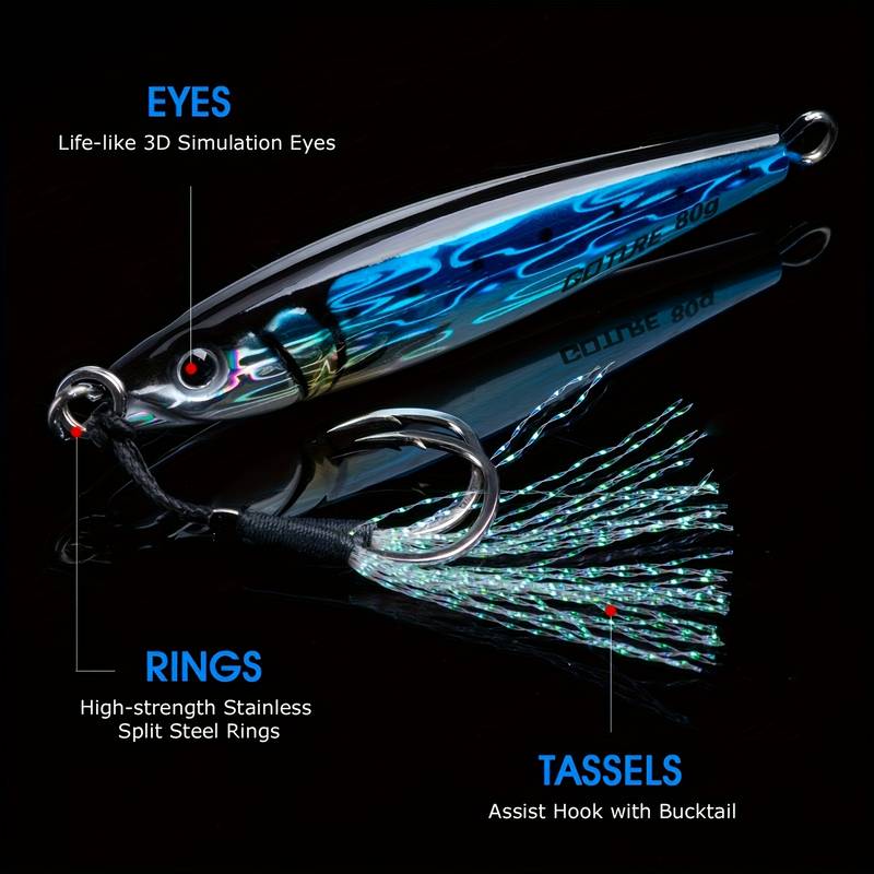 With weights ranging from 60g to 150g, these jigs are perfect for targeting large fish species like tuna, salmon, snapper, and more. The quick drop action and double assist hooks ensure you have a reliable method for enticing big fish.