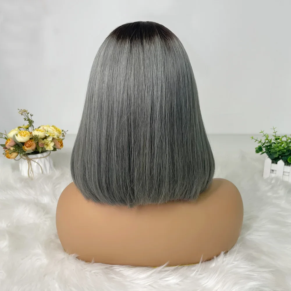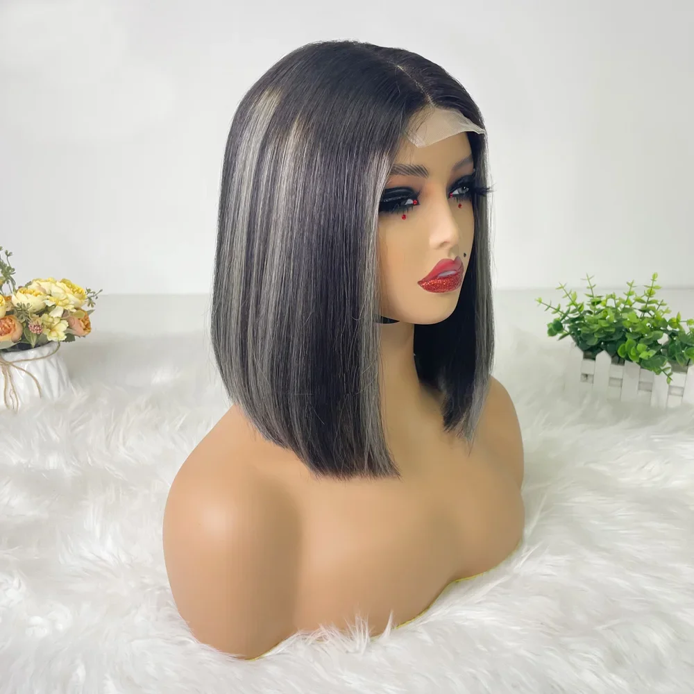 Hair Color: #1B, Stretched Length: 10inches, Density: 100% - 250% Density Super Double Drawn Bob Wig Human Hair Gray Brazilian Straight 2x6 Glueless Lace Closure Wigs For Women Pre Plucked