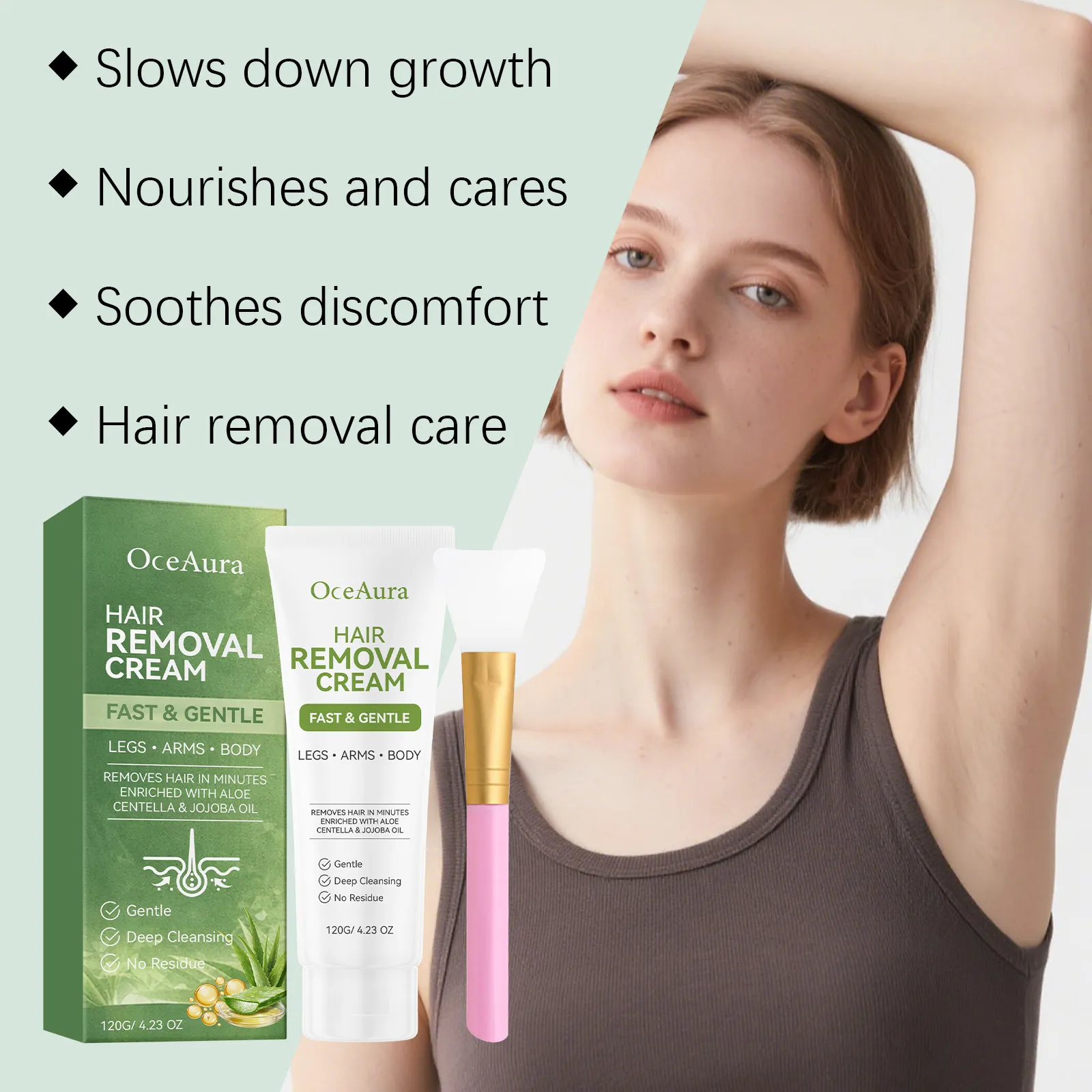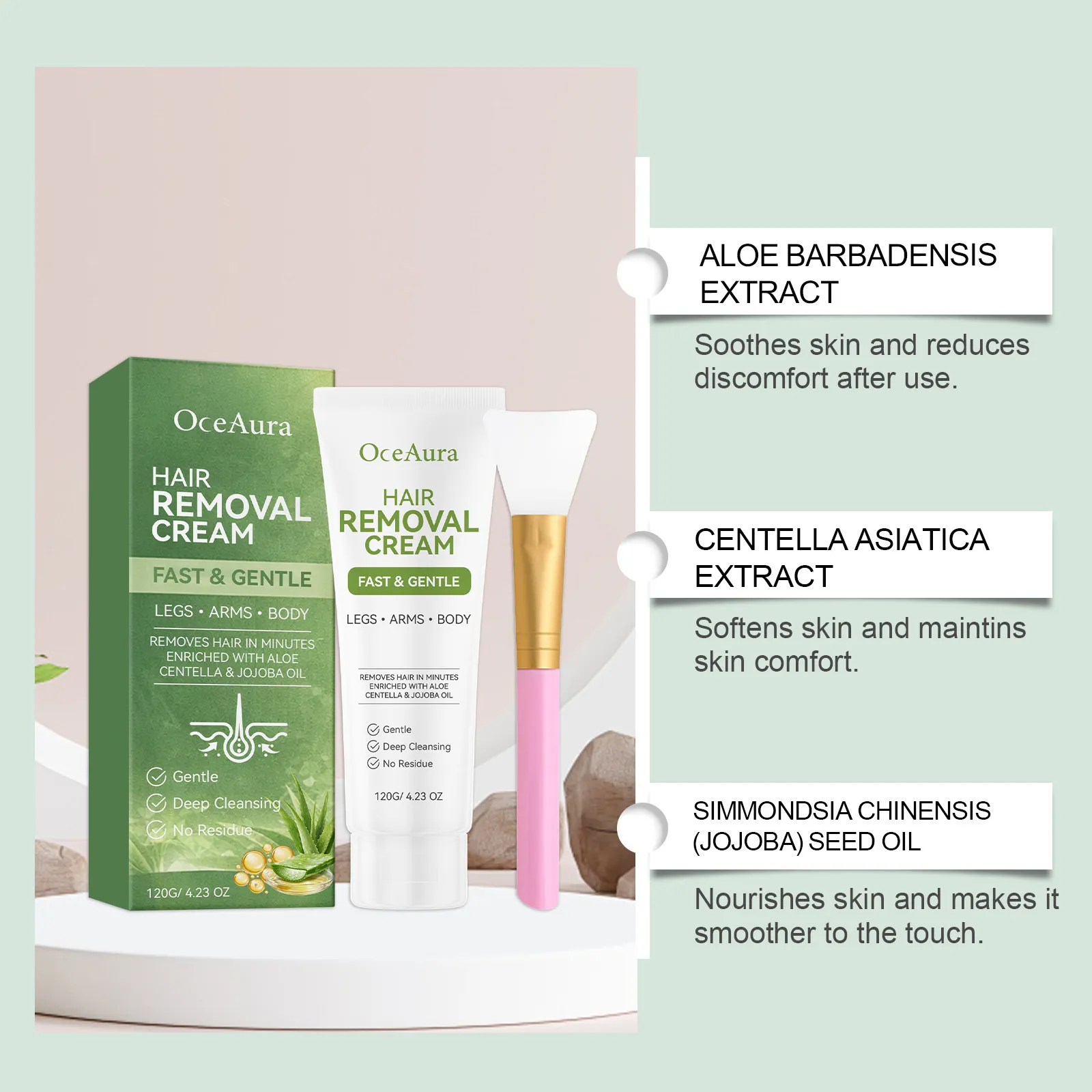 Achieve smooth, hair-free skin with OceAura Hair Removal Cream. Fast-acting formula enriched with aloe vera, centella, and jojoba oil for gentle, residue-free hair removal.