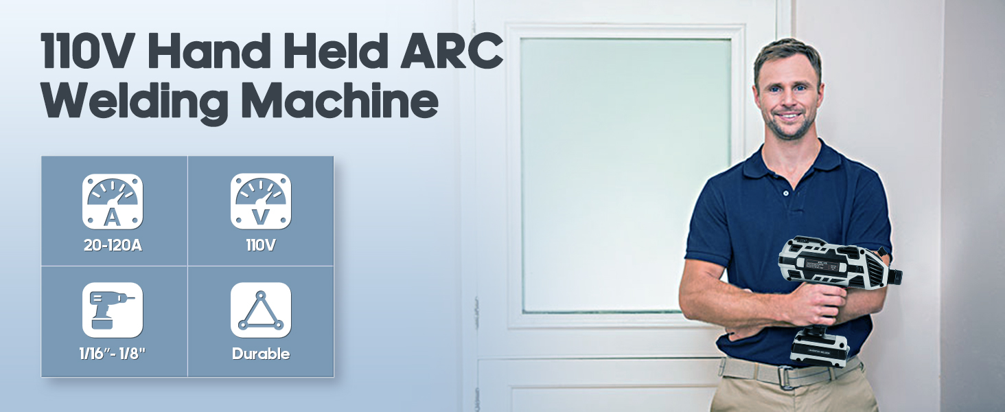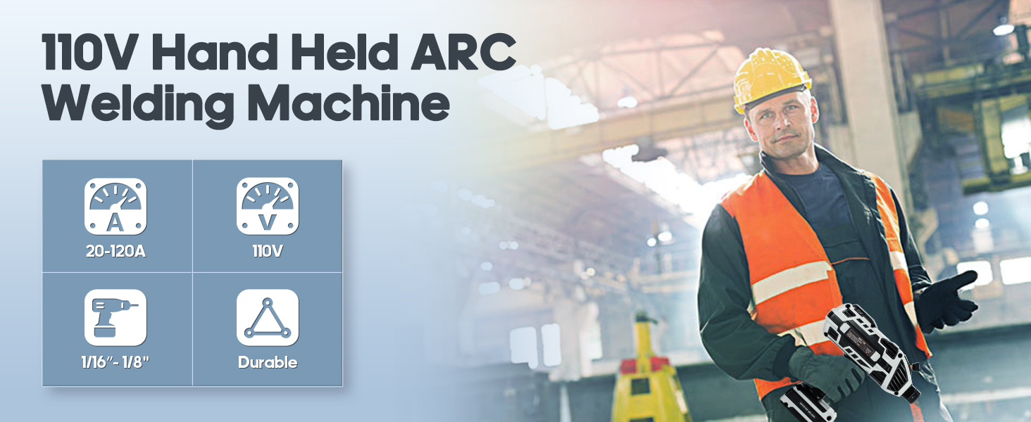 - 【20-120 Amp Welding Output】The handheld welder machine come with 20-120Amp welding output adjustable, simple knob design, 6 variable current adjustment, instant arc starting, non-stick welding rod. The operation is simple and easy to use.