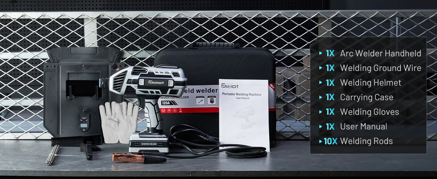 - 【Complete Equipment】1 X Portable Welding Machine, 1 X Welding Ground Wire, 1 X Welding Helmet, 1 X Welding Brush, 1 X Carrying Case, 1 X Welding Gloves, 1 X User Manual, 10 X Welding Rods.
