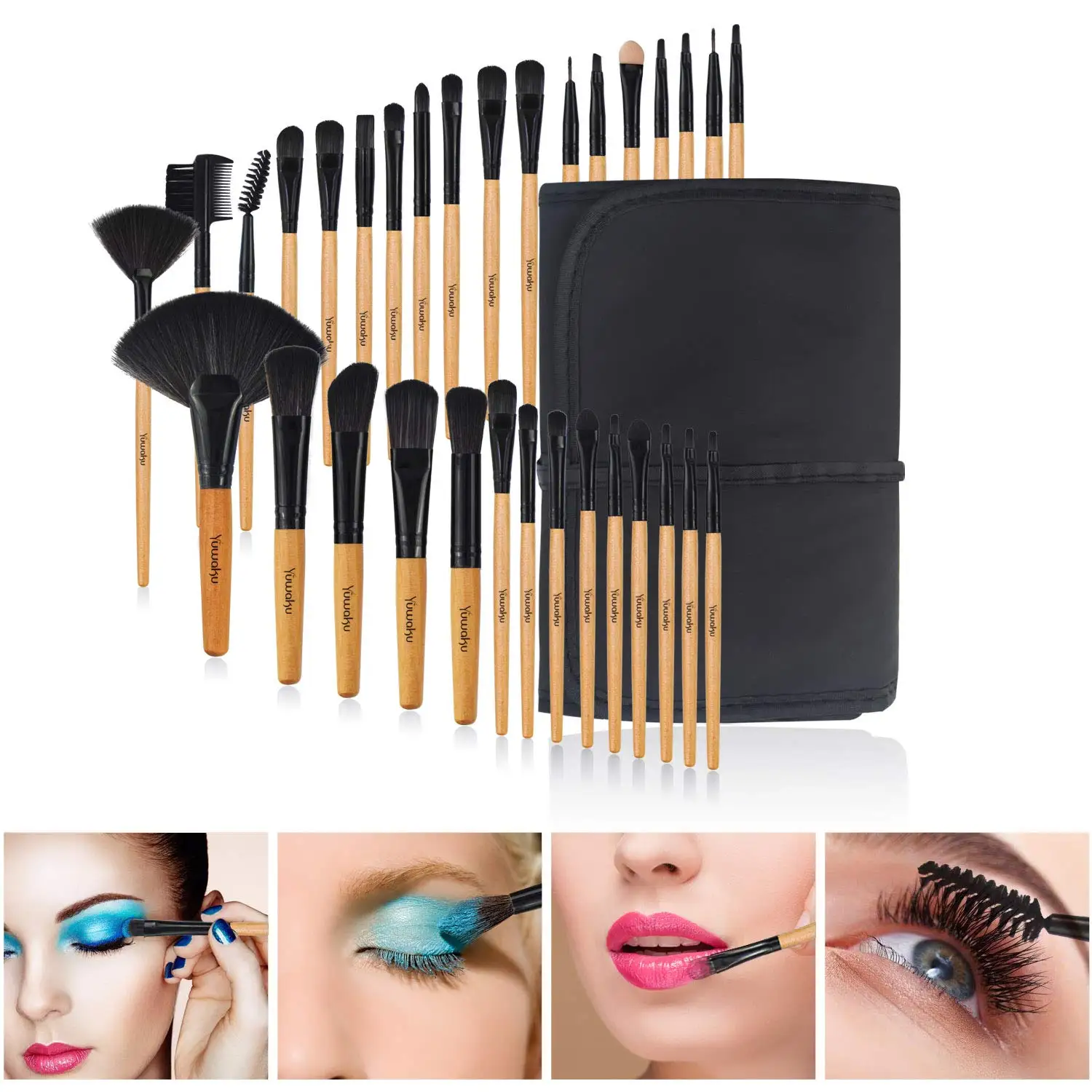 Handle Color: Black, Ships From: CHINA - Kaizm 32pcs Natural Hair Makeup Brushes Set Cosmetic Foundation Powder Eyeshadow Eyebrow Premium Wooden Make Up Brush Tools Kits