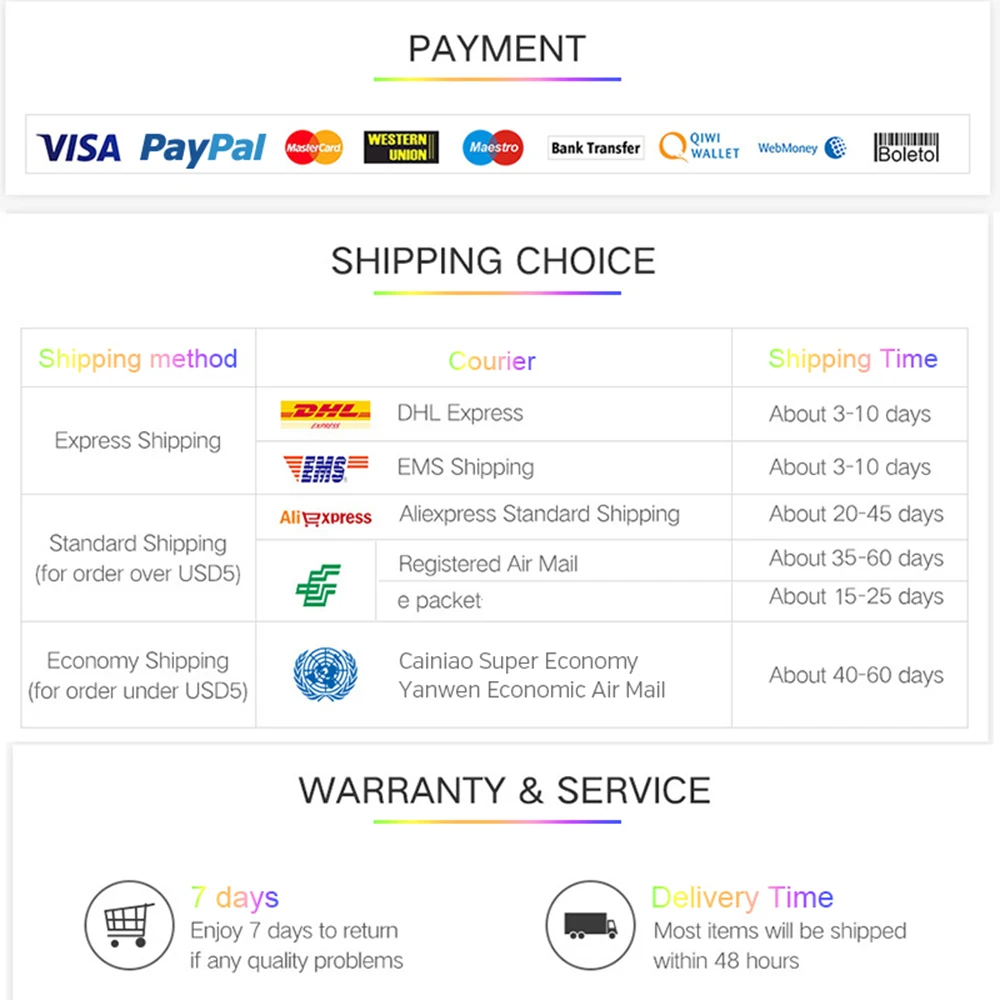 (2). We accept Alipay, Paypal, Western Union, TT. All major credit cards are accepted through secure payment processor ESCROW.