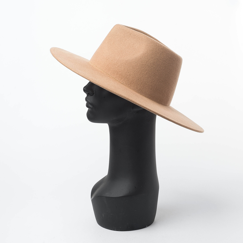 This woolen top hat showcases a wide brim that creates a striking silhouette, providing a balance of functionality and style. The clean lines and polished finish make it a versatile piece that pairs effortlessly with a variety of looks, adding an air of sophistication to both casual wear and elegant ensembles.