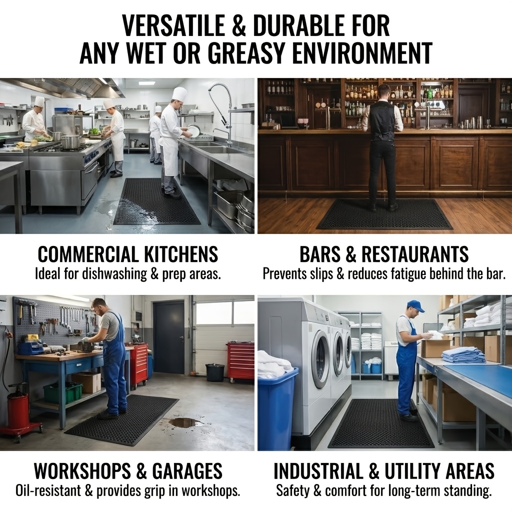 This robust floor mat is designed with durability and safety in mind. Made from high-quality rubber, it offers excellent protection against slipping, providing a secure surface for high-traffic areas. The thick rubber base is perfect for standing or working for extended periods, while the drainage channels help keep water, oil, and debris off your floor, keeping the mat clean and dry.