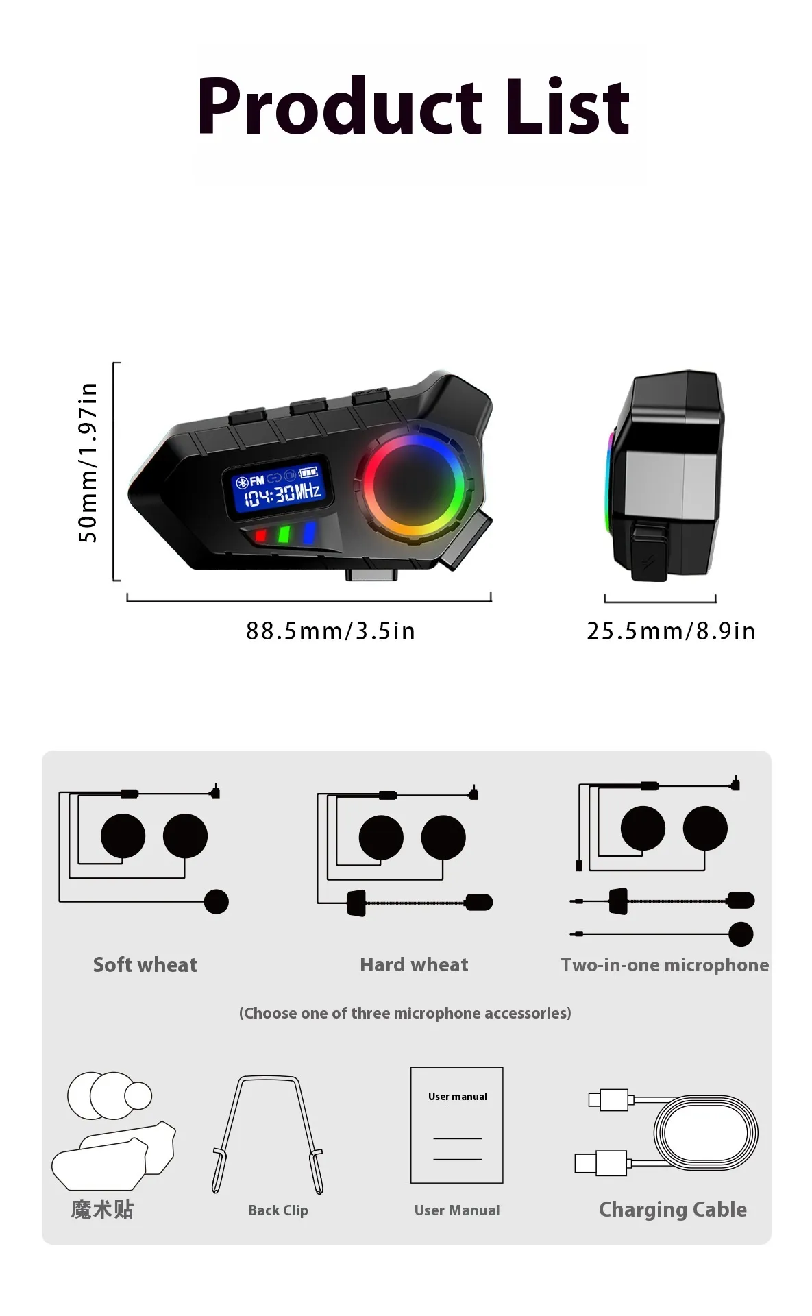Enhance your motorcycle rides with the Helmet Bluetooth Headset with Screen. This headset delivers crystal-clear music, voice calls, and navigation audio, providing a safe and enjoyable riding experience. The built-in screen allows for easy control and status monitoring while on the go.