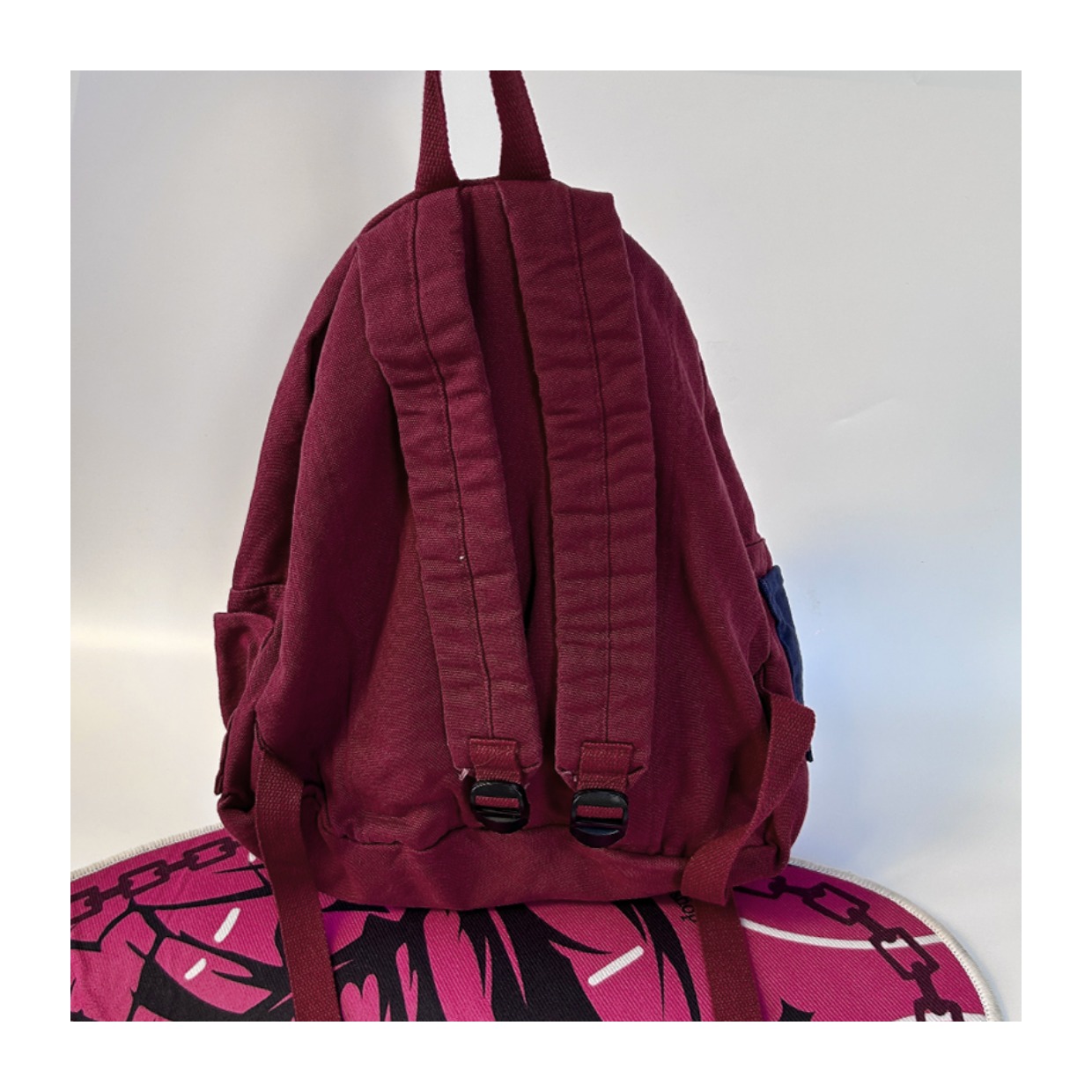 This backpack captures the essence of American retro fashion with its timeless leather accents, contrasting color palette, and bold yet