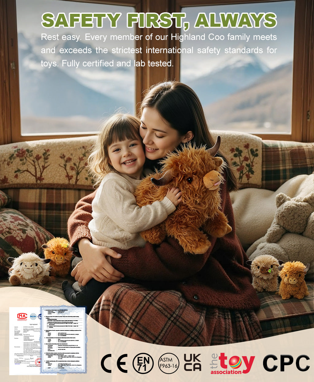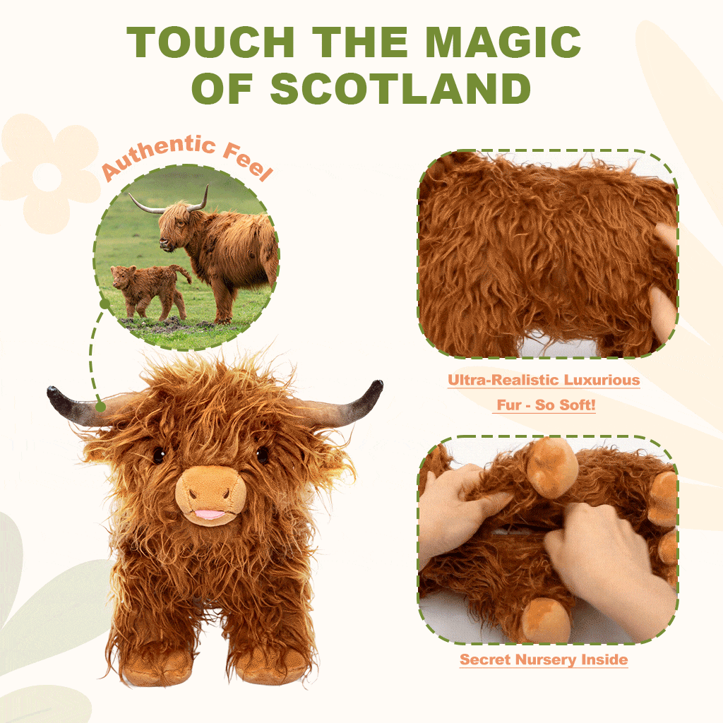 Watch the unboxing experience come to life. This is more than a toy—it's a reveal you'll want to share again and again. We've captured the wild beauty of the Highlands! Sink your hands into her incredibly long, luxurious fur, gentle enough for the most sensitive skin. Her soft, squeezable horns and hand-stitched features ensure safe play. Zip her up, and she's a majestic companion. Unzip her side, and discover her four adorable babies nestled safely within her cozy compartment. It's a surprise that never gets old.