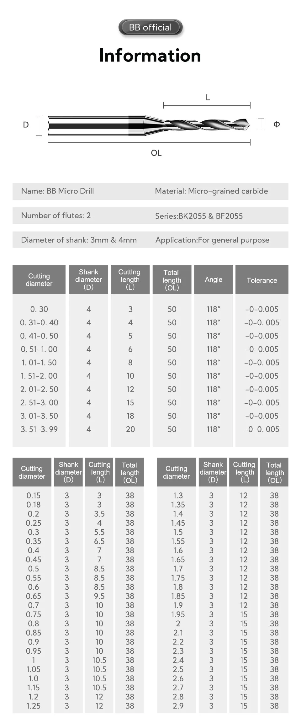 Hole Diameter: 8.1mm - BB 0.3~2.02mm Micro Drill Solid Carbide Bit Mini CNC Hole Making 3D Shank Diameter 4mm D4 Metal Steel Plastic 1PCS