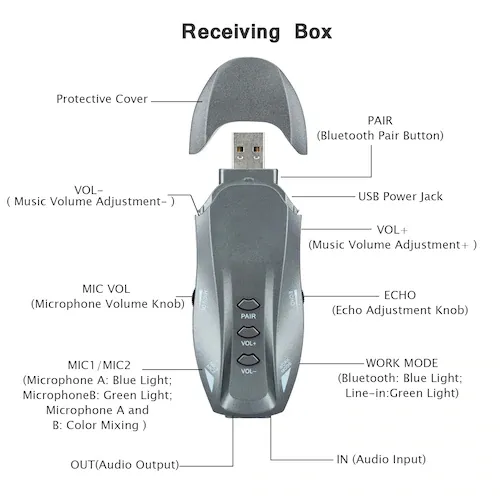 Basic functions: The receiver supports microphone volume, music volume, reverberation adjustment