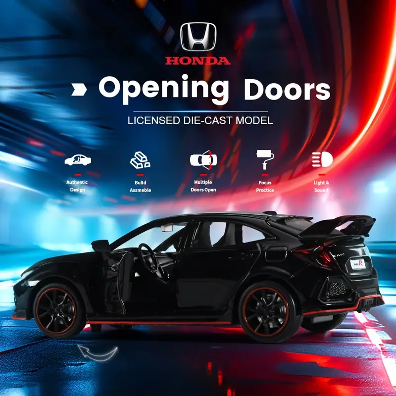 - Opening Doors: The Honda Civic Type R Die-Cast Model includes doors that open, providing an interactive element that adds to the realism of the toy. Kids and collectors can explore the interior and enjoy a hands-on experience with their miniature car.