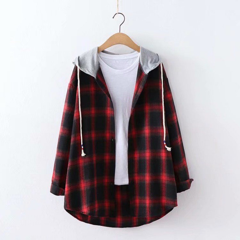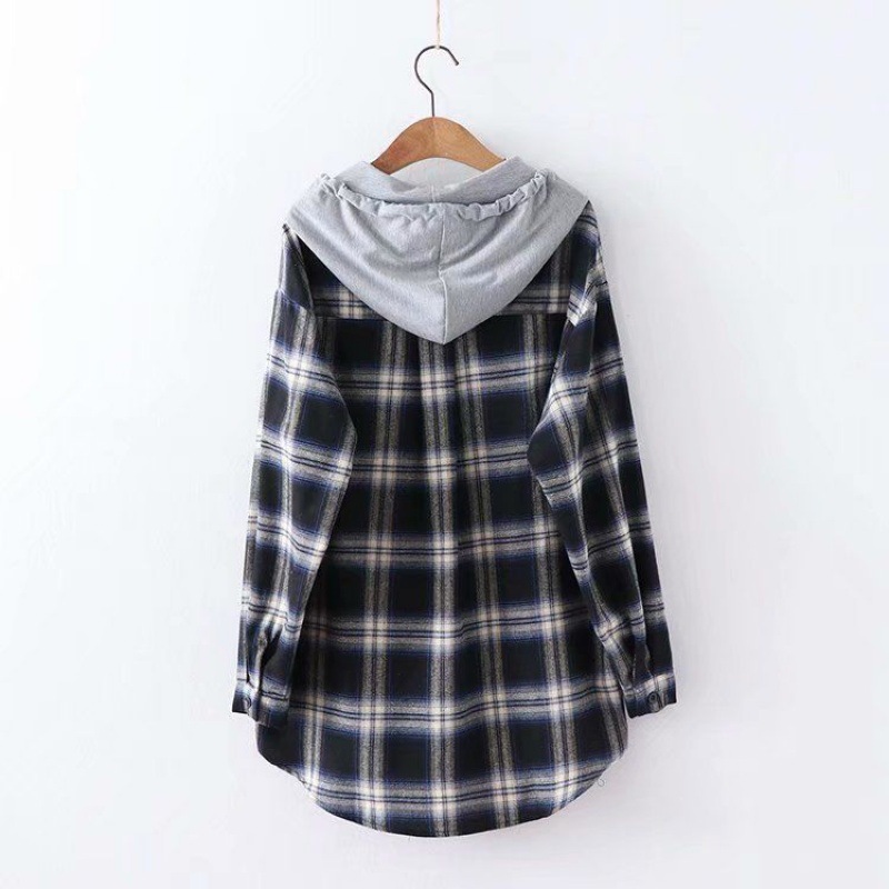 Hooded Loose Plaid Long Sleeved Shirt Women