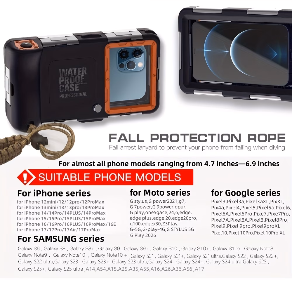 The HOT Deal Multi-function Outdoor Sports Swimming Snorkeling Kayaking Underwater Photography with Lanyard 15 Meters/50 Feet Deep Diving Phone Case Protective Cover Suitable for iPhone 16/15/14/13/12 Pro Max/XR/XSMAX, Suitable for Samsung Galaxy is a high-performance waterproof phone case engineered for durability, safety, and functionality in extreme environments. Designed to withstand depths of up to 15 meters (50 feet), the HOT Deal Multi-function Outdoor Sports Swimming Snorkeling Kayaking Underwater Photography with Lanyard 15 Meters/50 Feet Deep Diving Phone Case Protective Cover Suitable for iPhone 16/15/14/13/12 Pro Max/XR/XSMAX, Suitable for Samsung Galaxy allows users to take photos and videos underwater with confidence.