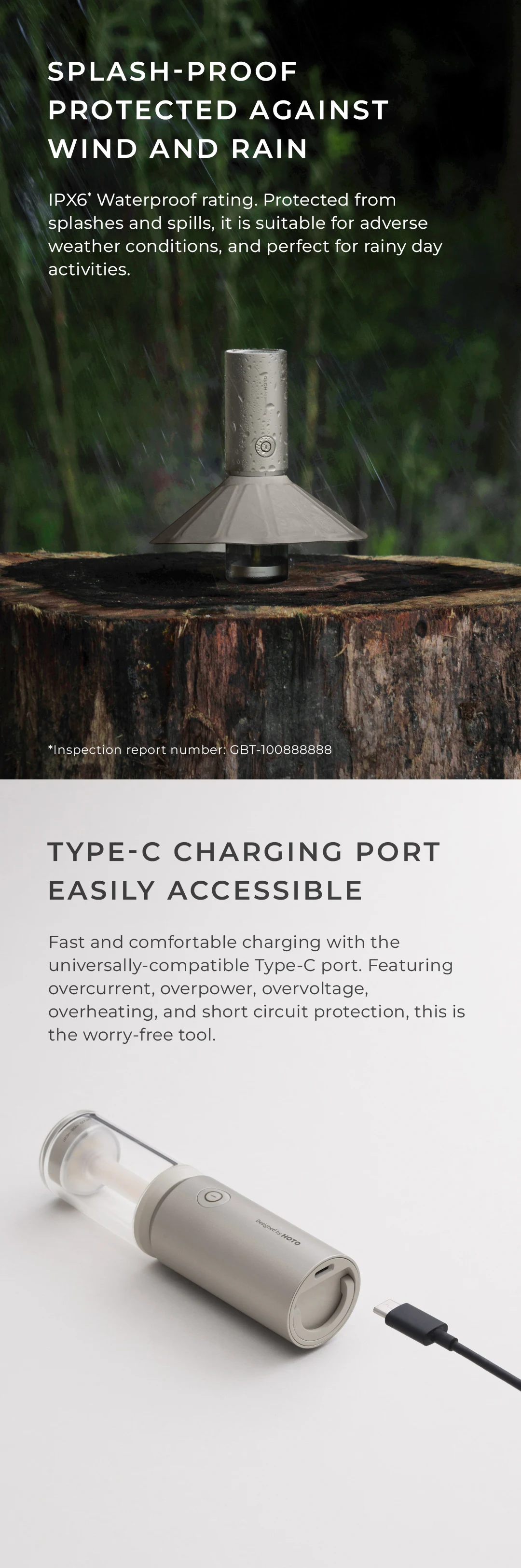 2. 180 lumens, 3100mAh lithium battery, IPX6 waterproof rating, Type-C charging