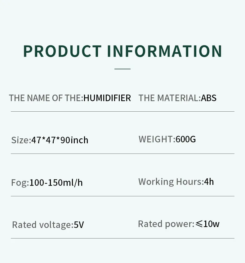 Diseñado pensando en la tranquilidad, el humidificador antigravedad funciona silenciosamente, garantizando que no perturbe su entorno. Ya sea que esté durmiendo, trabajando o disfrutando de una tarde tranquila, puede disfrutar de los beneficios de la humidificación sin ruidos molestos.