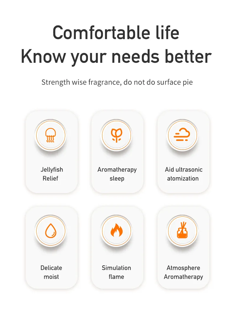- Mejor estado de ánimo y relajación: El efecto calmante de llama de medusa y la aromaterapia relajante ayudan a reducir el estrés, la ansiedad y promueven la relajación.