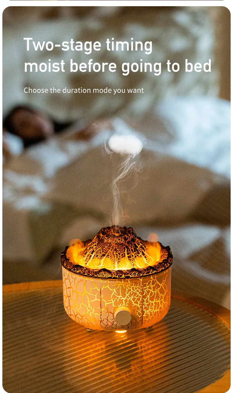 - El humidificador Volcano cuenta con un efecto dinámico de llama de medusa que simula el movimiento de las medusas en el agua, creando una experiencia visual relajante y sobrenatural. Esta característica no solo es hermosa, sino que también añade un toque de calma a cualquier habitación.
