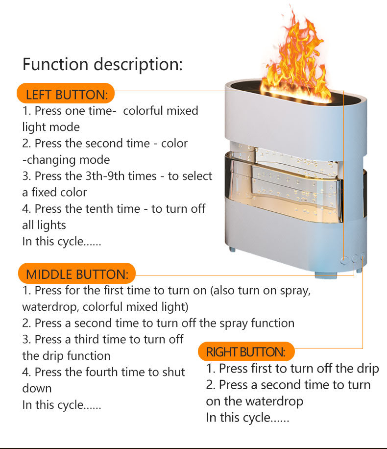 Funcionamiento sencillo: Pulsa el botón central para encender y activar los modos de rociado, gotas de lluvia y llamas coloridas; pulsa el botón izquierdo para cambiar la luz según tu modo de luz favorito. Haga clic derecho para apagar el botón de gotas de lluvia.