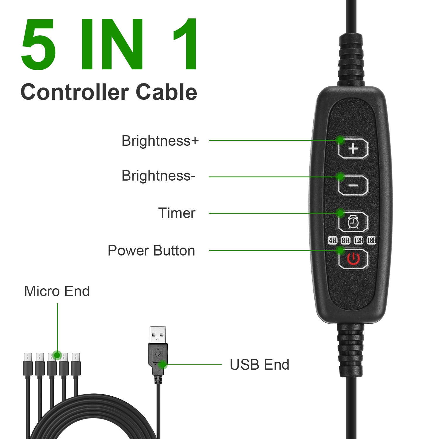 - *5-Level Brightness & 4 Timer Settings*:Our seed starting trays come with 5 full-spectrum grow lights. Each grow light has 4 warm white lights,2 red lights and 2 blue lights. The 5-level adjustable brightness and 4 timer settings(4/8/12/18H) meet the needs of different growth stages of seeds and make seeds grow healthily. In addition,the controller cable allows you to control the light intensity and photoperiod with ease,ensuring the most optimal growth environment for your plants.