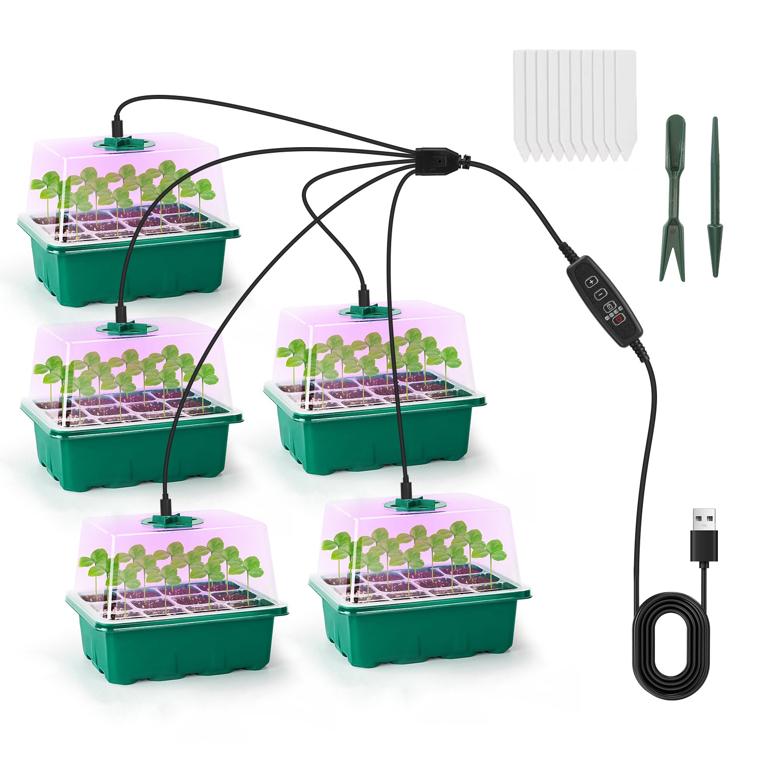 - *All-In-One Growing Solution*:This germination kit includes everything you need to start your seeds off right:5x 12-Cell Clear Seed Trays,5x Green Base Trays,5x Clear Covers,5x Grow Lights,1x 5 IN 1 Micro USB Controller Cable,2x Garden Tools,10x Labels. All works together to create the perfect environment for seed propagation. Ideal for beginners and seasoned gardeners alike.