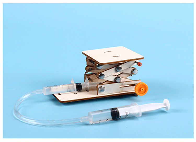 syringe is pushed, the water is pushed into the syringe with a hole, thereby driving the bracket to rise, which becomes a hydraulic lifting