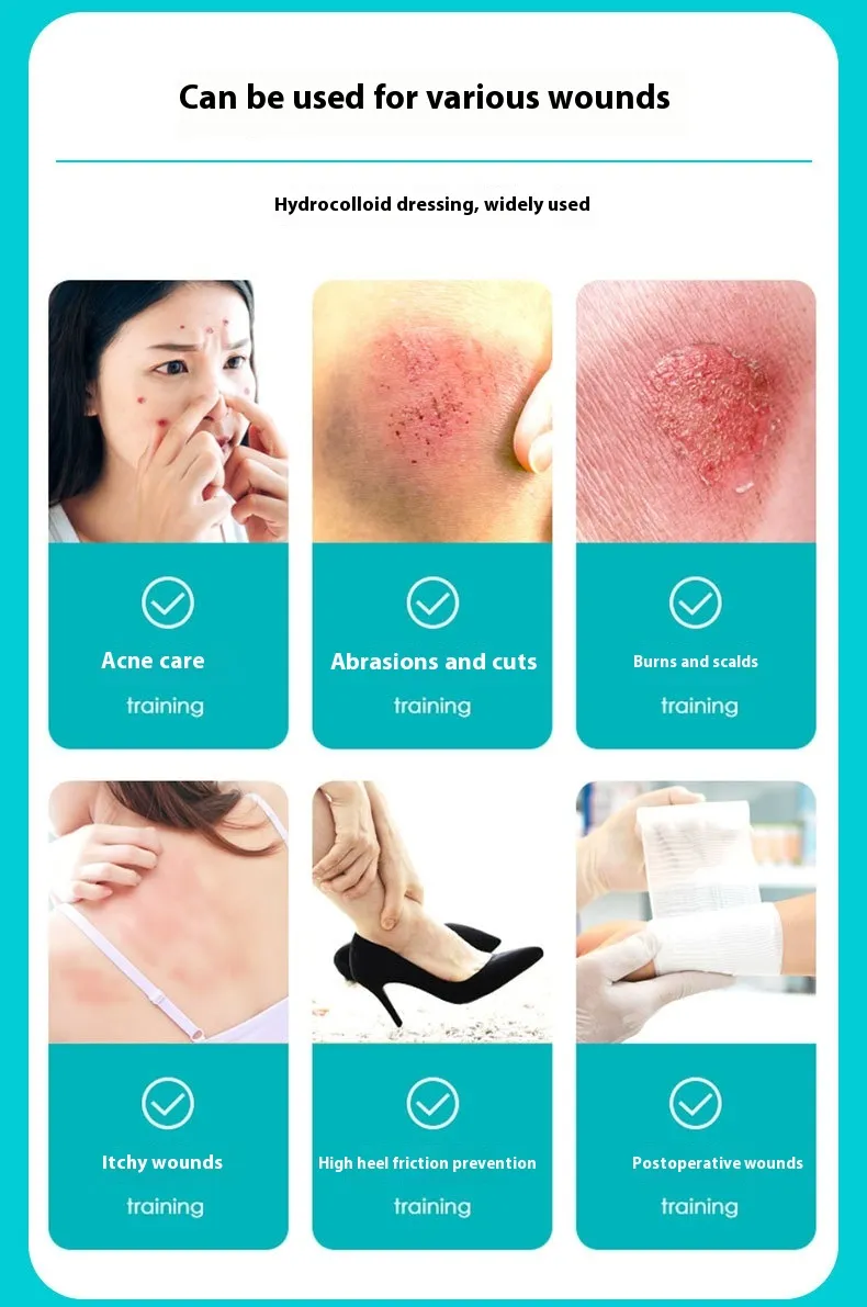 Crafted from biocompatible and skin-safe materials, the hydrocolloid layer interacts with wound exudate to form a soft gel that maintains hydration, protects against infection, and cushions the affected area. Its gentle adhesive ensures secure attachment without damaging surrounding skin during removal.