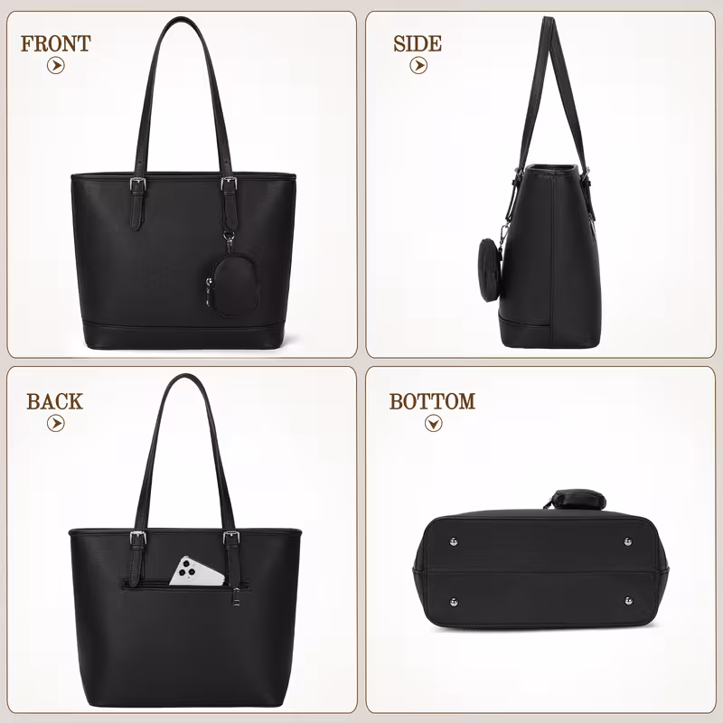 The IGOLUMON Women’s Large Capacity Tote Bag offers the perfect combination of style, durability, and functionality. Unlike many other totes, it features a spacious interior with a dedicated laptop compartment and a removable pouch to keep your items organized. The high-quality faux leather ensures it’s both durable and easy to clean, while the sleek black design makes it suitable for any occasion. Whether for work, travel, or everyday use, this tote bag is the perfect accessory for modern women on the go.