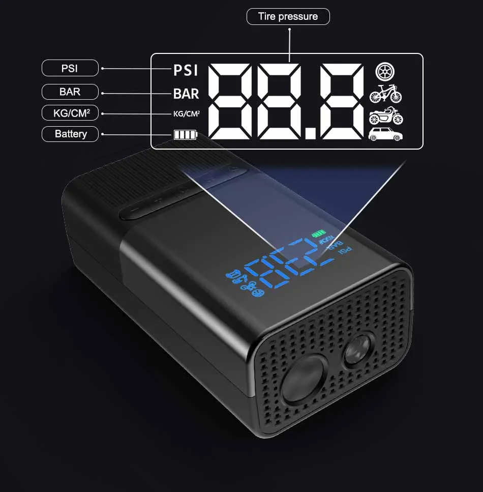 lithium batteries. When fully charged, you can inflate 3 car tires from 0-2.5bar; 12 motorcycle tires from 0-2.2bar; 20 bicycle tires with