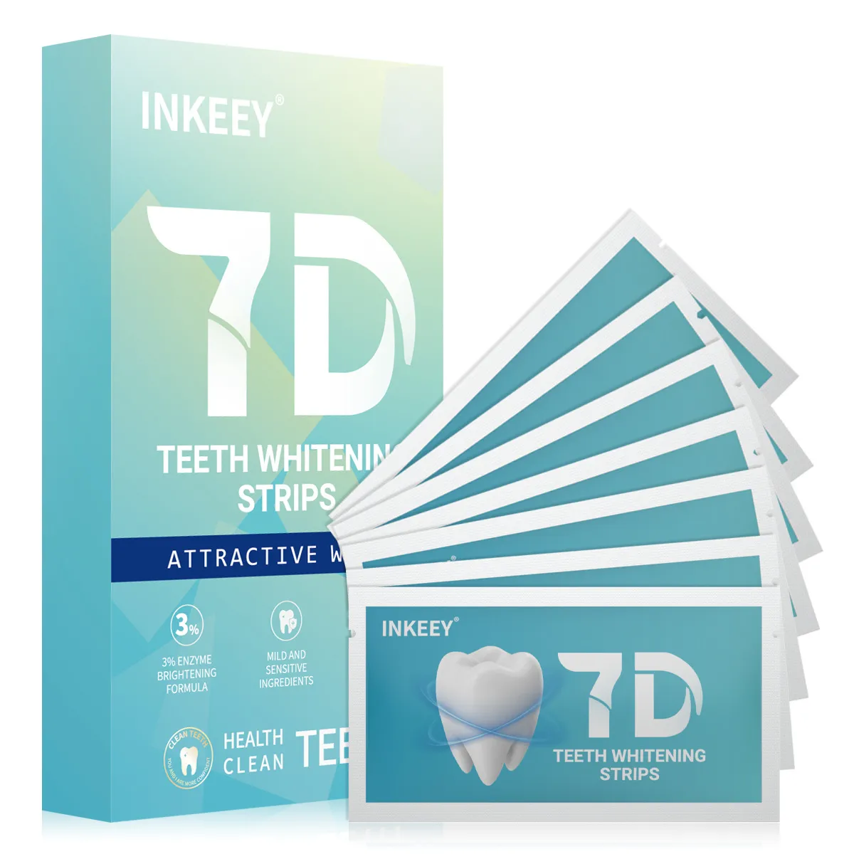 INKEEY 7D Teeth Whitening Strips Attractive White with 3% enzyme brightening formula and dry strip technology for gentle at-home whitening.
