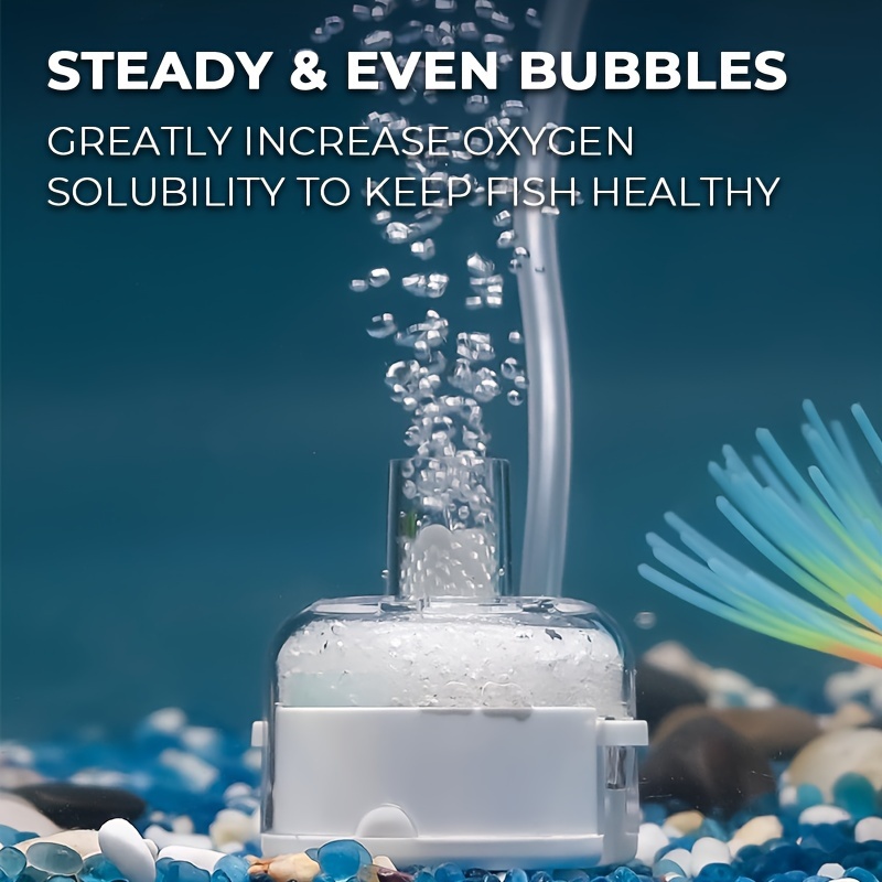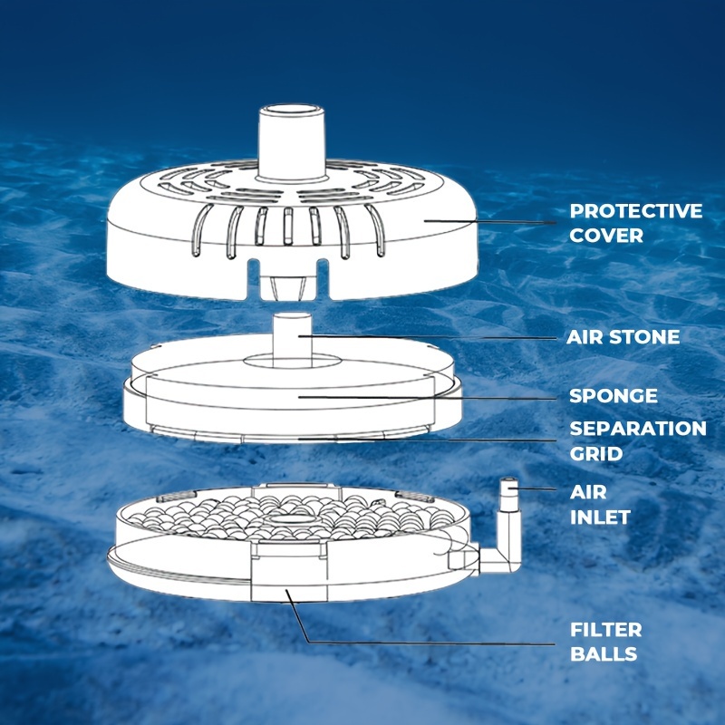 The integrated air stone releases fine bubbles that increase oxygen levels and improve water circulation. As bubbles rise, they gently pull water through the sponge, creating a quiet, energy-efficient filtration system ideal for nano tanks and delicate species.