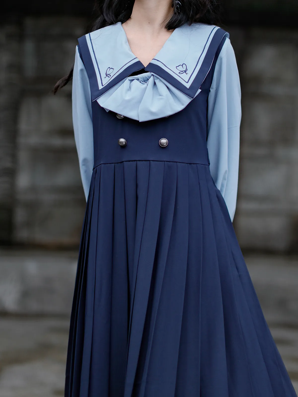 Japanese Navy Neck Embroidered Dark Blue Preppy Dress