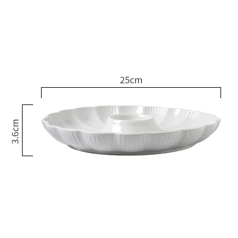 This dish is specifically designed for serving dumplings and vinegar dipping sauce, but its versatility extends far beyond just dumplings. The wide, shallow design allows for easy placement of dumplings or other small dishes, while the dip well is ideal for holding your favorite sauces, whether it's tangy vinegar, soy sauce, or a spicy dipping sauce.Its size and shape make it a perfect choice for serving traditional Japanese dumplings like gyoza or shuumai, or even other small appetizers like spring rolls or bite-sized sushi.