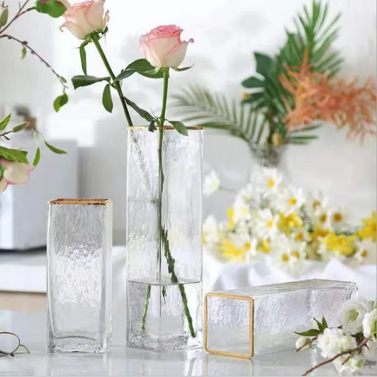 Jarrones de vidrio transparente pintados en dorado para decoración del hogar y bodas.