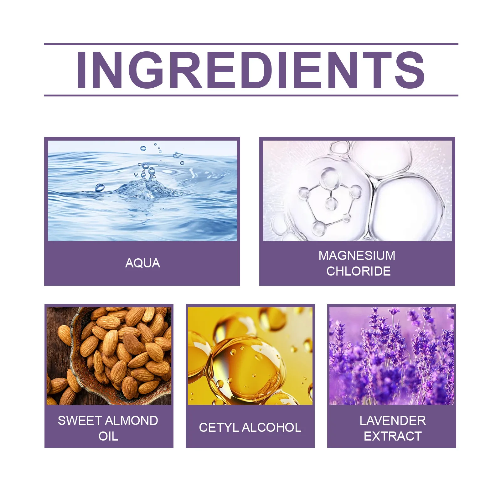Ingredients: Water, lavender extract, magnesium chloride, sweet almond oil, cetyl stearate