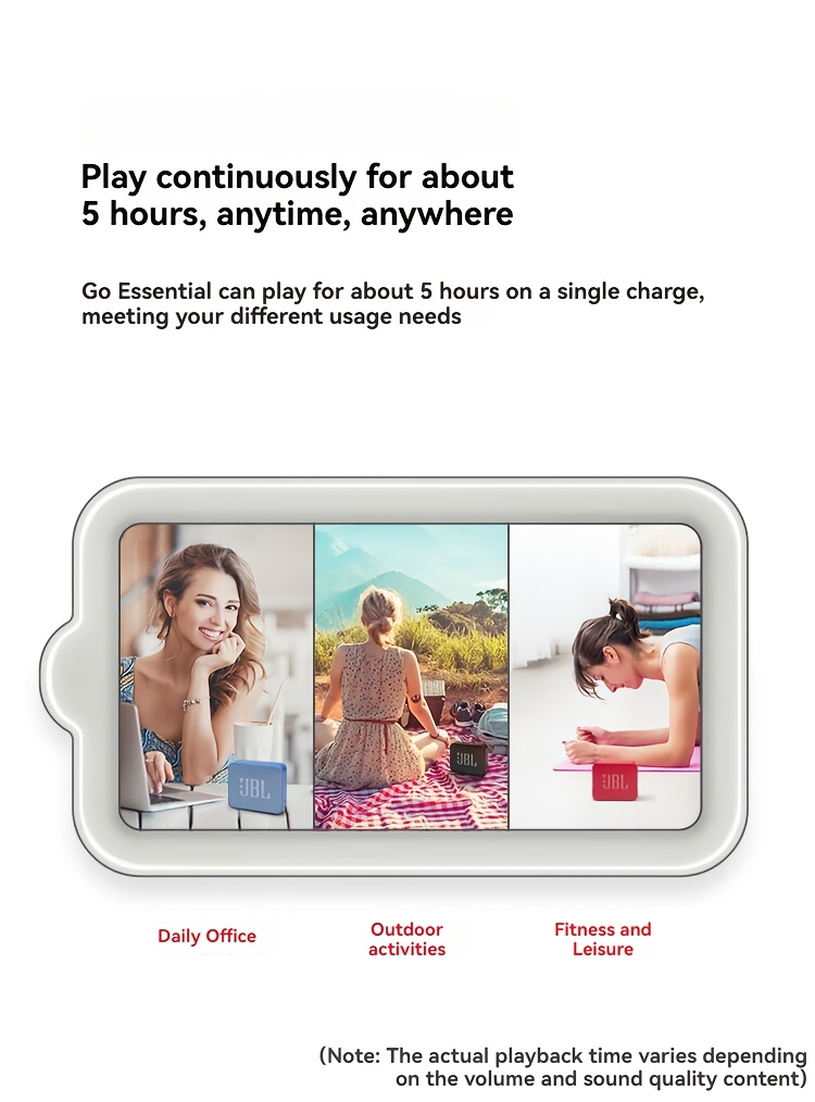 Powered by a rechargeable lithium-ion polymer battery, the JBL GO ESSENTIAL delivers up to 5 hours of uninterrupted music on a single charge. That’s plenty of time for pool parties, backyard barbecues, study sessions, or travel playlists.