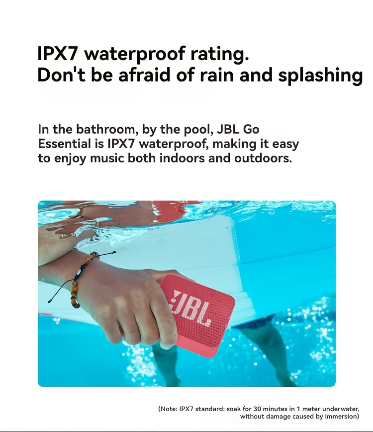 Weighing around 180 grams, the JBL GO ESSENTIAL is built for mobility. It’s small enough to carry effortlessly yet tough enough to handle daily adventures.