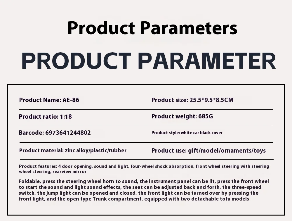 Designed to replicate the legendary Toyota AE86 TRUENO, which became famous for its drift racing prowess, this 1:18 scale model brings to life one of the most iconic cars in the automotive and anime world. Whether you’re a fan of Initial D or a die-hard drift racing enthusiast, this model will take you back to the thrilling moments of street racing and adrenaline-pumping action.