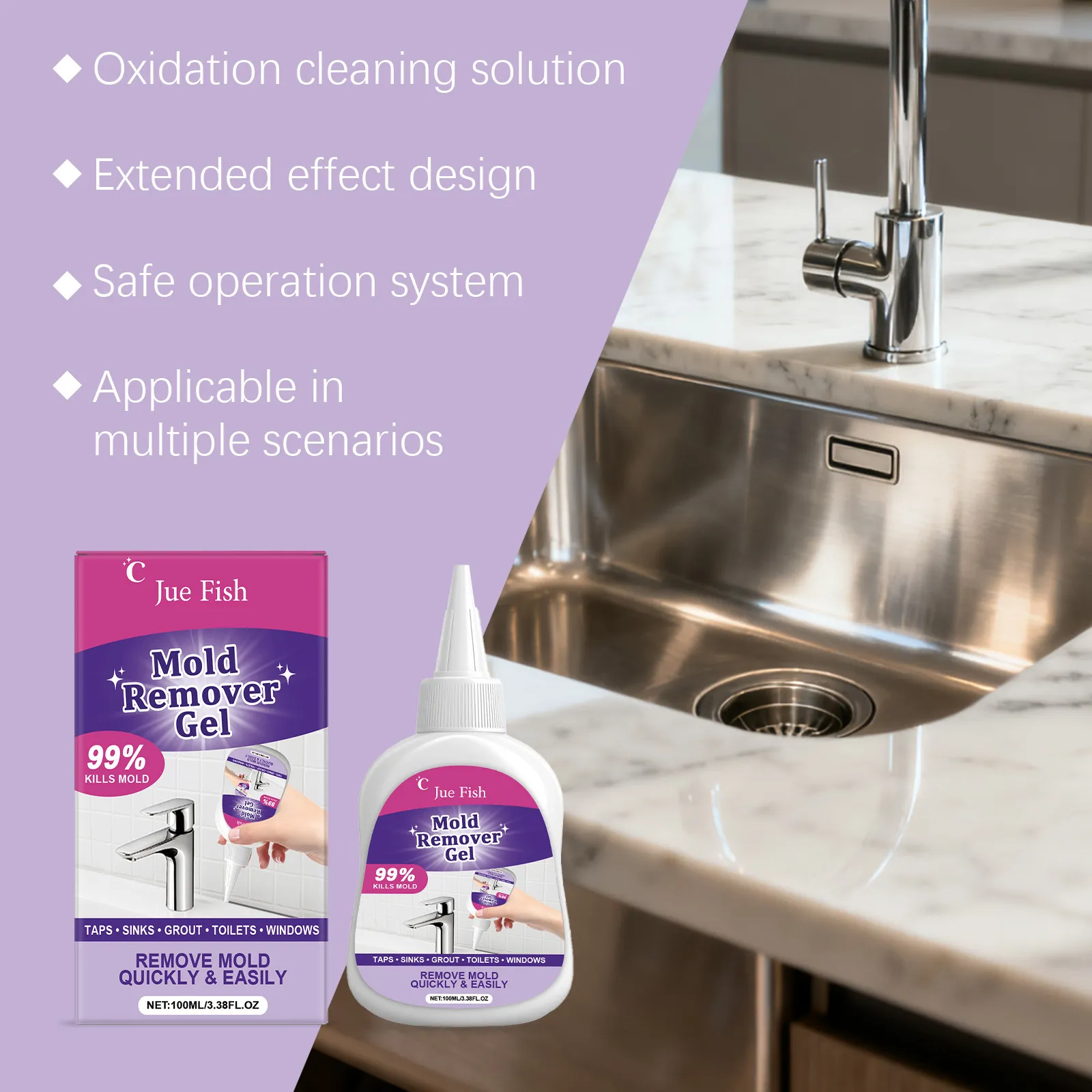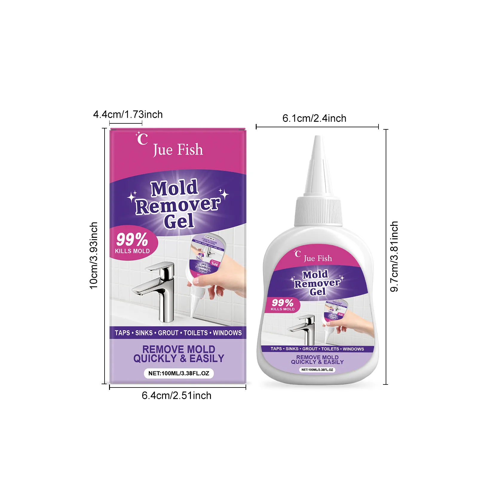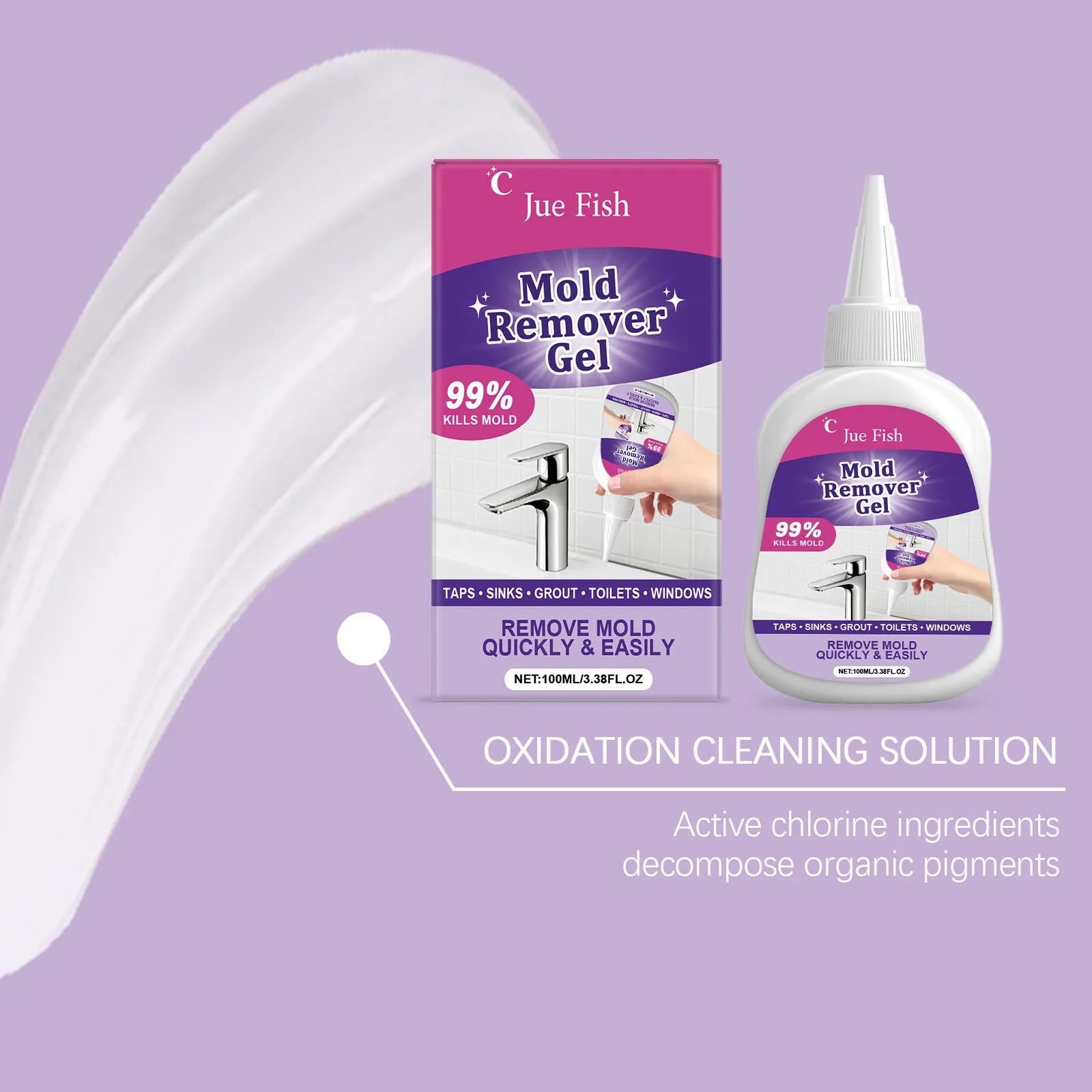 Jue Fish Mold Remover Gel is a targeted cleaning gel designed to tackle mould and mildew staining in the most common “problem zones” around the home—especially where moisture sits, airflow is limited, and grime builds up over time. The packaging positions it as a quick, easy solution and highlights a 99% kills mold claim, with intended use across taps, sinks, grout, toilets, and windows.