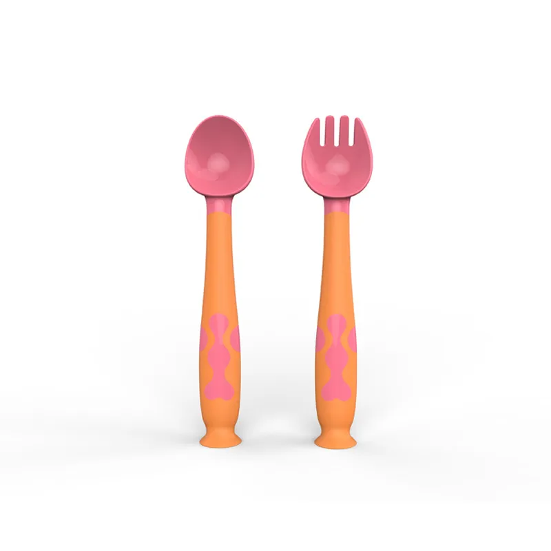 Juego de cuchara y tenedor giratorios de entrenamiento para bebés que aprenden a comer.