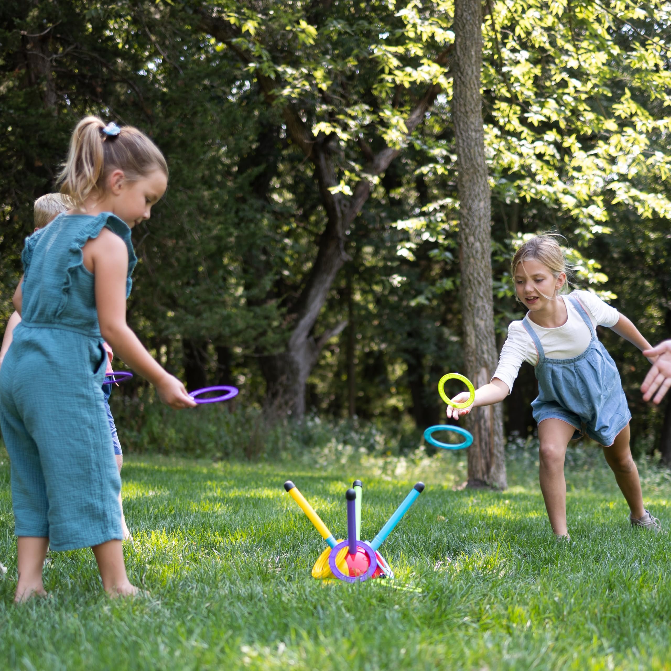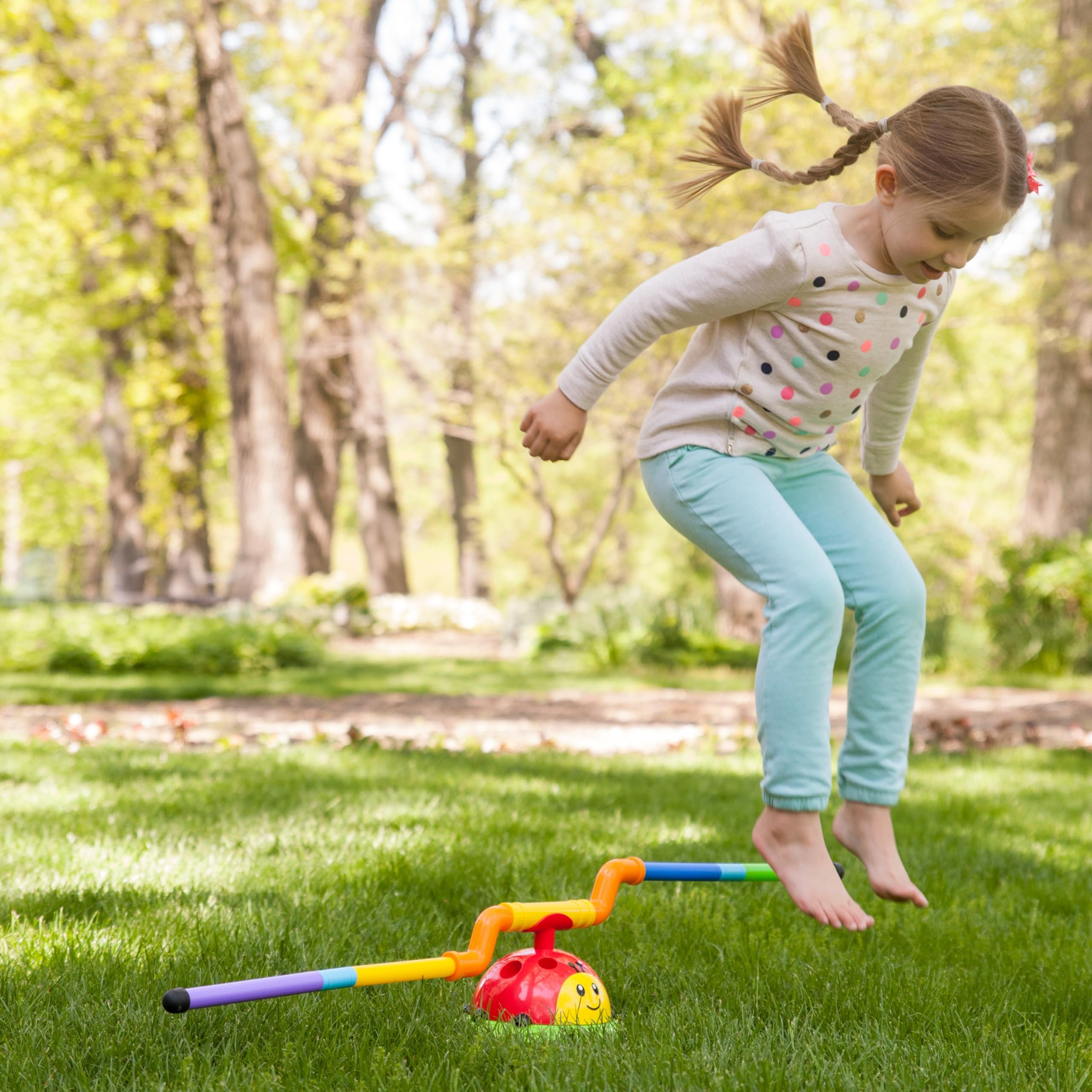 JUEGO DE SALTAR CON POSTE GIRATORIO que se transforma en un juego de lanzamiento de aros giratorios; ¡Diversión activa sin fin!