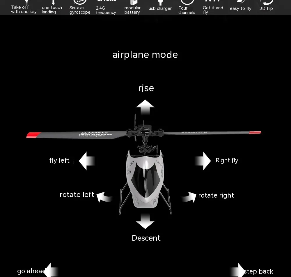 6. Control remoto de 4 canales, alarma de bajo voltaje, protección de rotor bloqueado, protección contra pérdida de control, conversión de timón grande y pequeño, despegue y aterrizaje con un solo clic, entre otras funciones.
