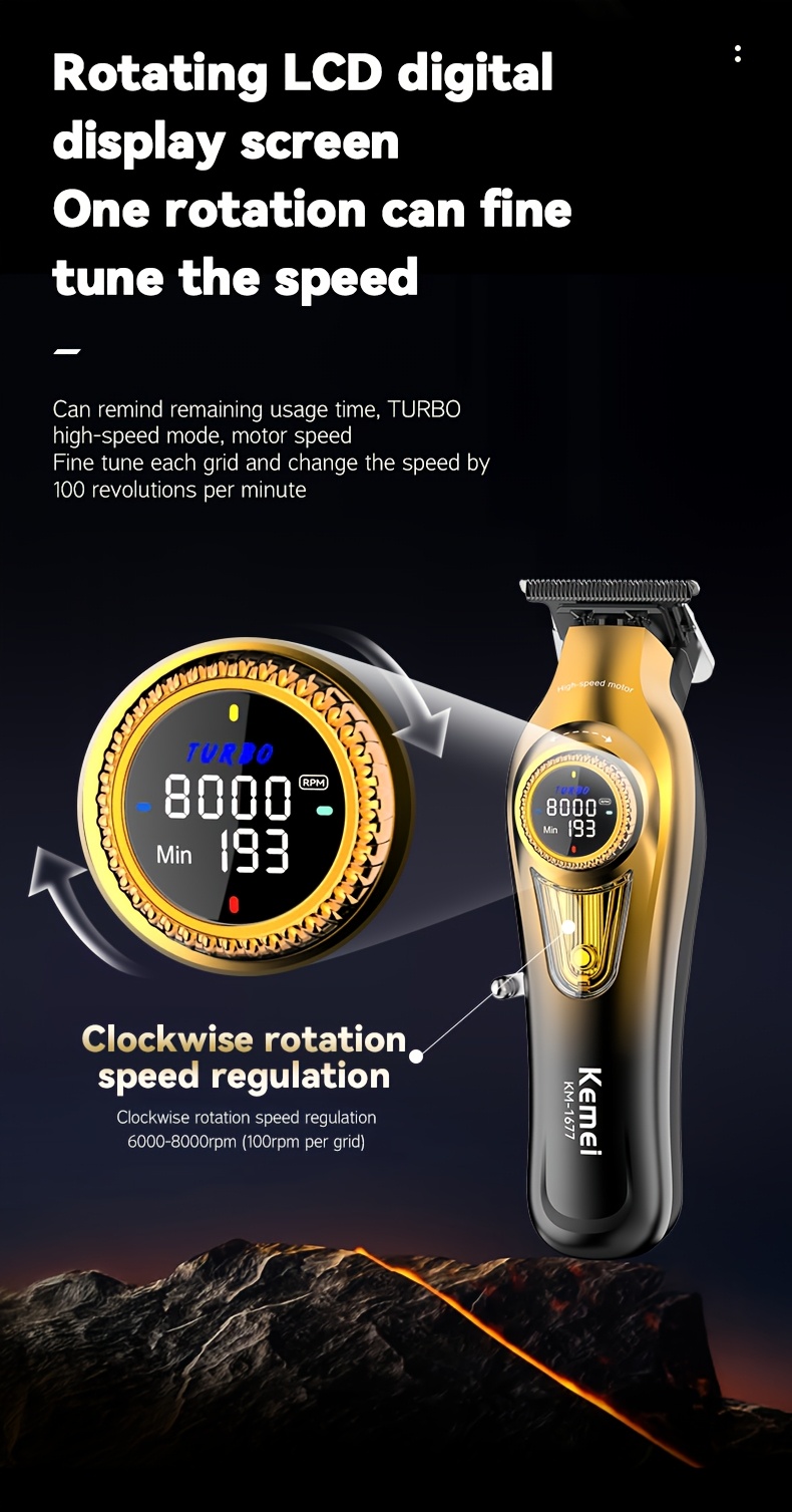 In conclusion, the KEMEI KM-1677 Electric Hair Clipper is a high-performance grooming tool designed to provide precision, power, and comfort. With its 8000 RPM motor, adjustable speed settings, powder metallurgy blades, and luxurious design, this clipper ensures a smooth, efficient grooming experience. The USB charging and LED display add convenience, making this clipper an ideal tool for both salon use and home grooming. Packaged as the perfect gift for men, this clipper delivers professional-quality results every time.