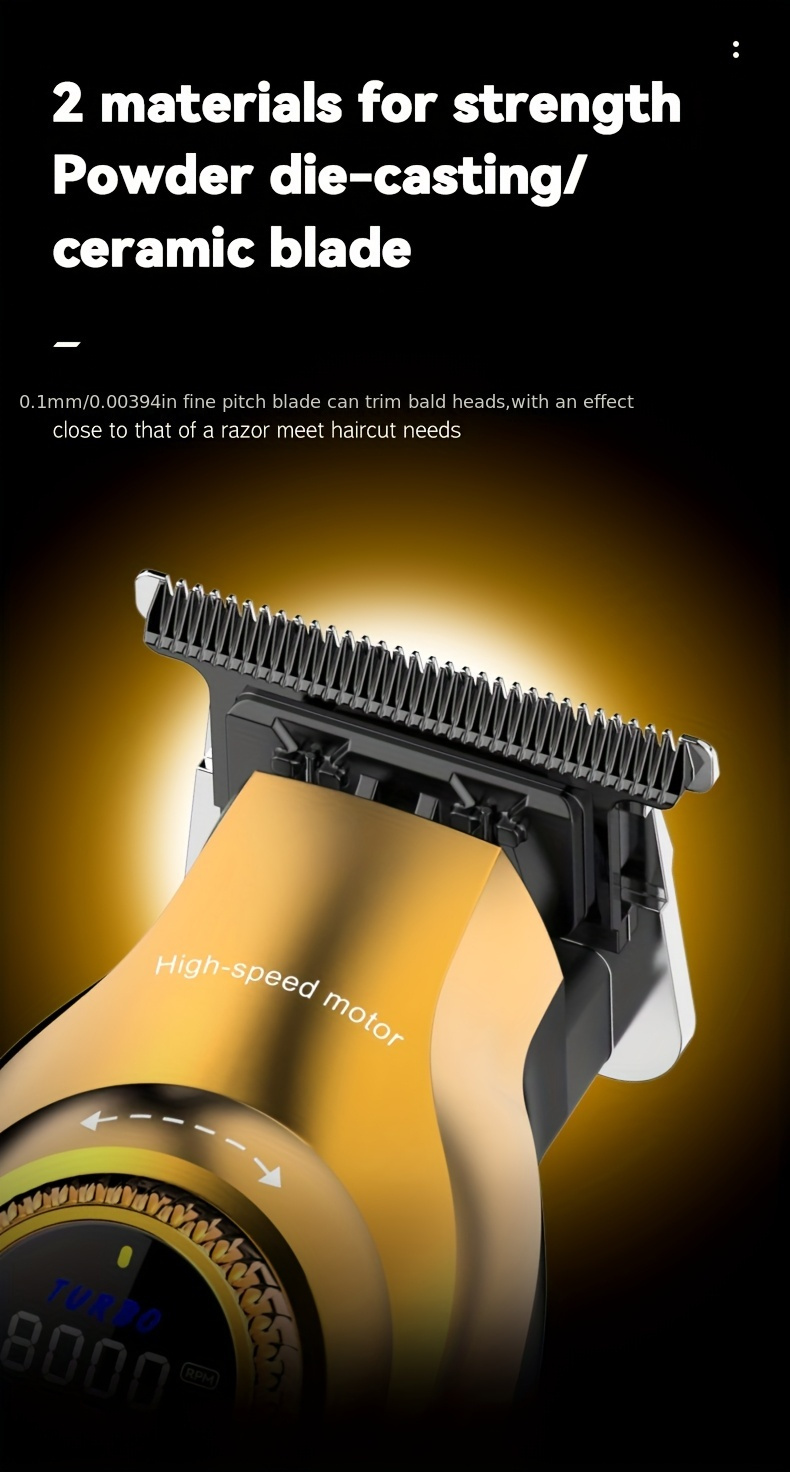 The clipper is equipped with precision powder metallurgy blades, which provide sharpness and durability, ensuring clean cuts with minimal effort. The metal gradient body gives the clipper a luxurious, stylish appearance, while the LED display provides real-time information on the clipper’s battery status and current settings. USB charging ensures you can easily recharge the clipper for quick, efficient use.