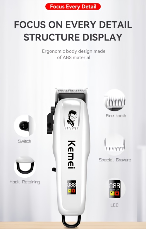In conclusion, the KEMEI Professional Electric Hair Clipper in milk white color is a powerful and versatile grooming tool that combines high-speed cutting, durability, and comfort. Featuring a stainless steel blade, LED smart display, and constant temperature feature, it provides a professional-quality shave with adjustable settings for customized cutting. Whether you're a professional or simply want a top-quality clipper for home use, this device ensures precision and smooth results for all your grooming needs.