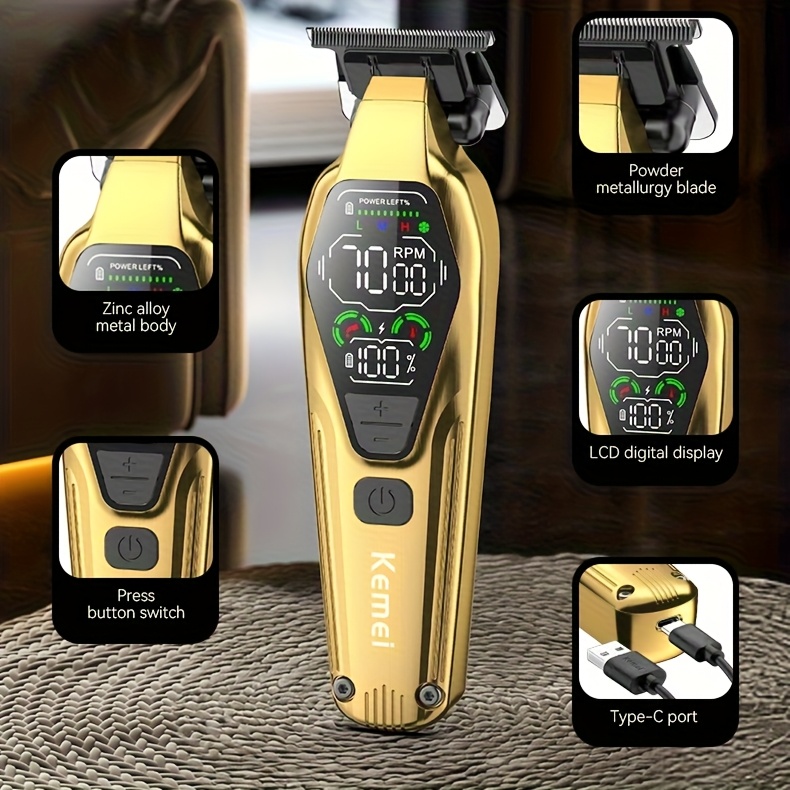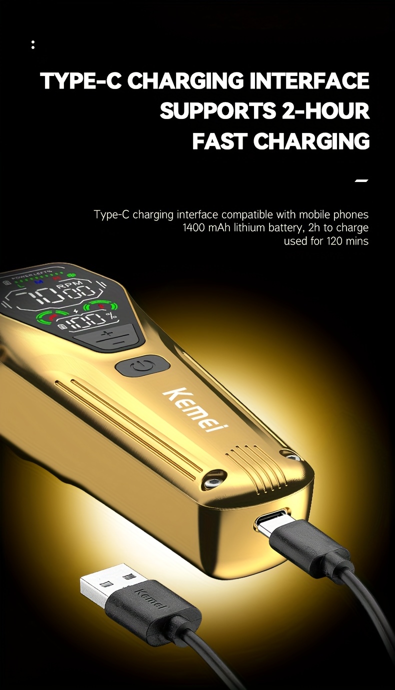 In conclusion, the KEMEI Professional Hair Clipper with Carving Scissors is a high-performance grooming tool that delivers precision, style, and convenience. Featuring high-speed motor performance, adjustable speed, stainless steel blades, and luxury golden design, this clipper set offers everything you need to create perfect haircuts and detailed carvings. The USB rechargeable feature and LED HD display provide efficiency, while the gift box packaging makes it the perfect luxury gift for any special occasion.