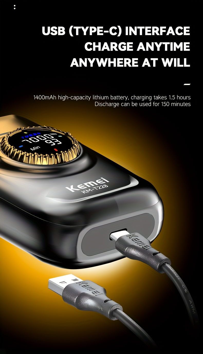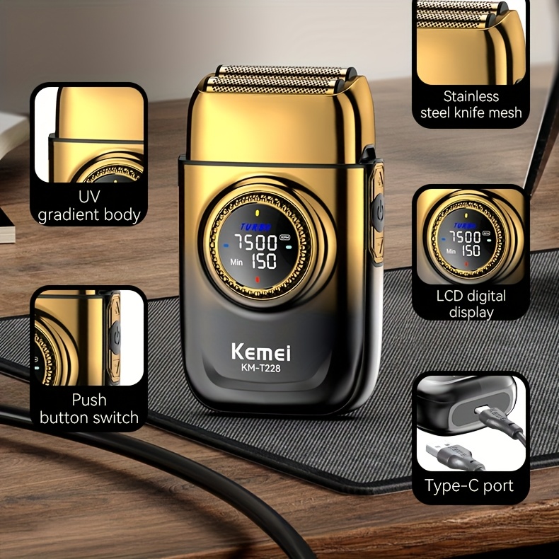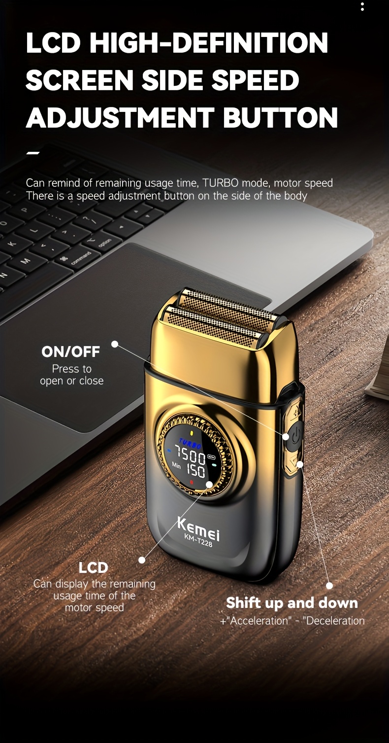 In conclusion, the KEMEI Reciprocating Shaver T288 is a luxurious and efficient grooming tool that provides high-speed shaving with dual blades and multiple speed settings. Perfect for bald head shaving and facial grooming, this high-power shaver ensures smooth, residue-free results. Its golden luxury design, LCD display, and USB charging make it a perfect holiday gift for any man who appreciates style and functionality in his grooming routine.