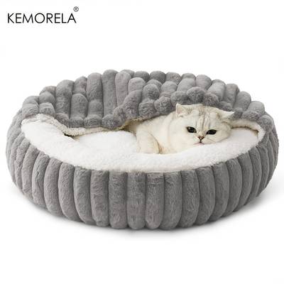 The KEMORELA Calming Warm Kitten Bed is a plush, hooded donut-style cat cave made from soft polyester with a non-slip base. Perfect for indoor cats and small pets, it offers warmth, comfort, and a safe space to cuddle, nap, and relax.